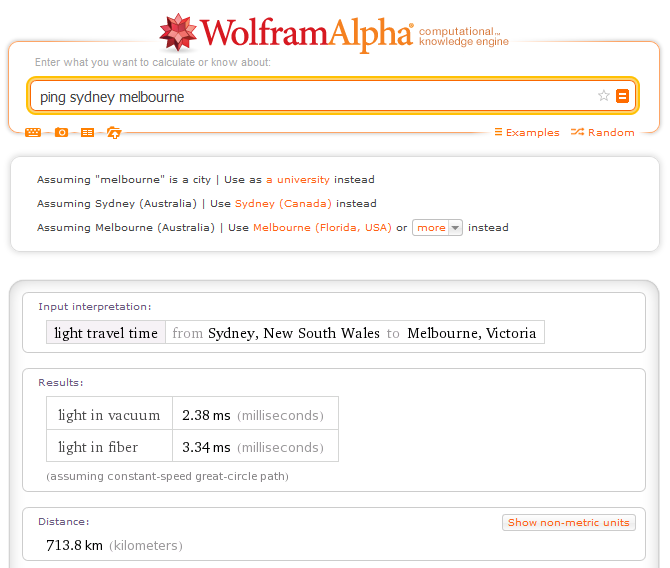 Also, occasionally I have heard the statement that, yes, it is possible to ping Sydney to Melbourne in < 1ms. Well, with the help of Physics 101 we can prove that this cannot be the case. Enter Wolfram Alpha to save us some time - let’s check how long it would take for a beam of light to travel from Sydney to Melbourne (just in one direction, not bouncing back again):