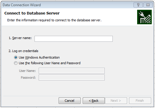 The usual problem I’ve run into is this – If I’m using my local Excel or InfoPath client, when attempting to add a new data connection, you get prompted with a screen such as that below. Selecting Windows Authentication will use your local machine credentials and won’t work. The Username and Password box as we all know are for SQL authentication.
